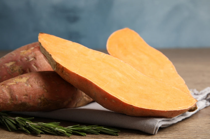 Ce mois-ci, nous vous présentons un féculent qui vient souvent faire de la concurrence à notre éternelle pomme de terre : la patate douce. Avec un indice glycémique plus faible, une meilleure teneur en fibres et une très grande richesse en vitamine A (200% des apports journaliers recommandés pour 100 gr), la patate douce a de quoi remporter la compétition.