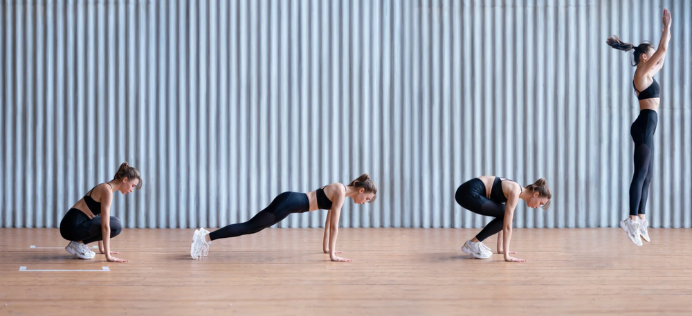 - Les burpees : Un combo explosif ! Accroupissez-vous, posez les mains au sol, envoyez les pieds en arrière (position pompe), revenez en squat et terminez par un saut. Le cardio monte vite, les muscles travaillent de la tête aux pieds.