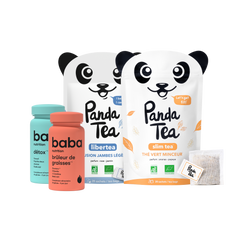 Mélanges de plantes certifiées bio | Brûleur : chicorée, artichaut, maté et guarana | Détox : fenouil, paprika, ananas et radis noir | 2 x 28 sachets en coton biodégradable | Formulés par un pharmacien