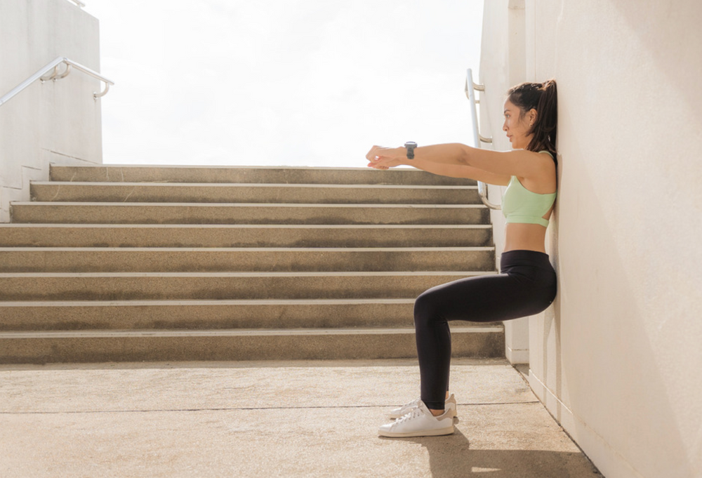 - Baissez-vous en gardant le dos plaqué au mur, et en avançant doucement vos pieds devant vous jusqu’à avoir vos genoux pliés en angle droit.