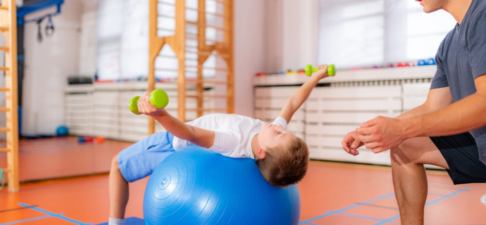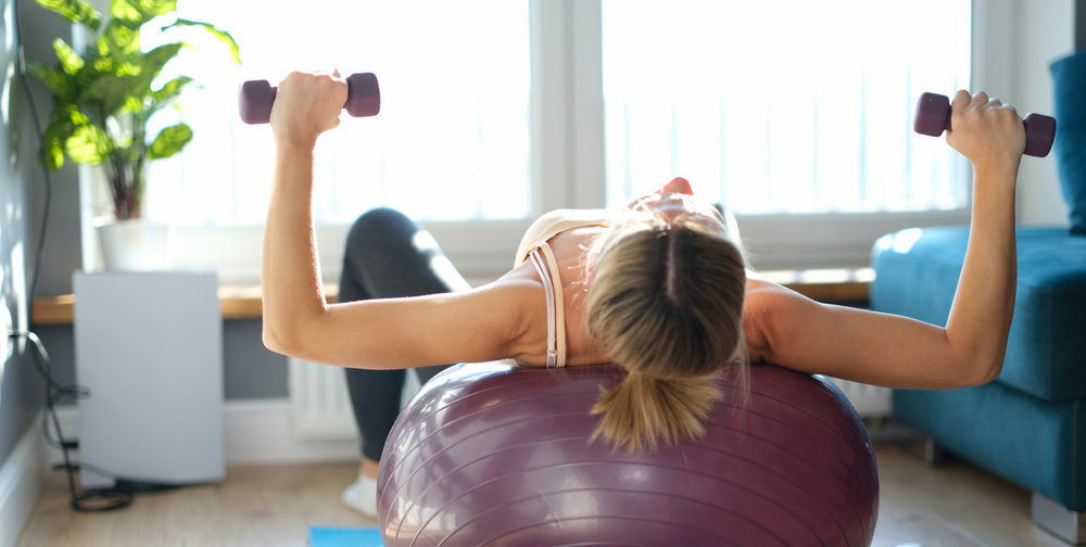 - Allongez-vous sur le dos, sur un tapis de yoga ou un ballon de gymnastique, un poids dans chaque main,