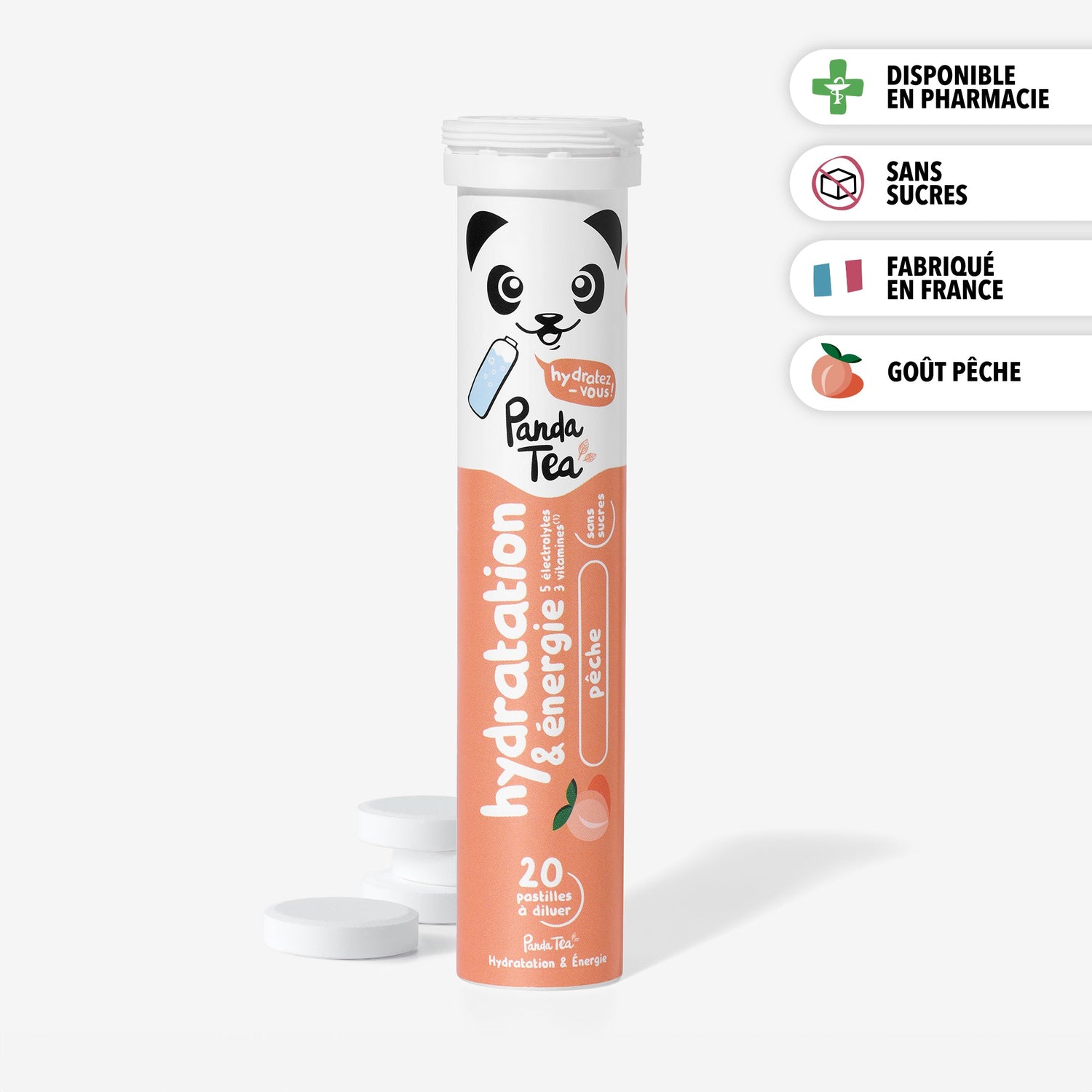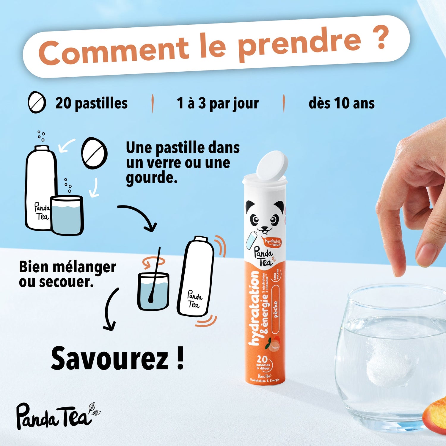 - Dissoudre une pastille dans 250 mL d’eau (verre) à 500 mL (gourde Panda Tea)