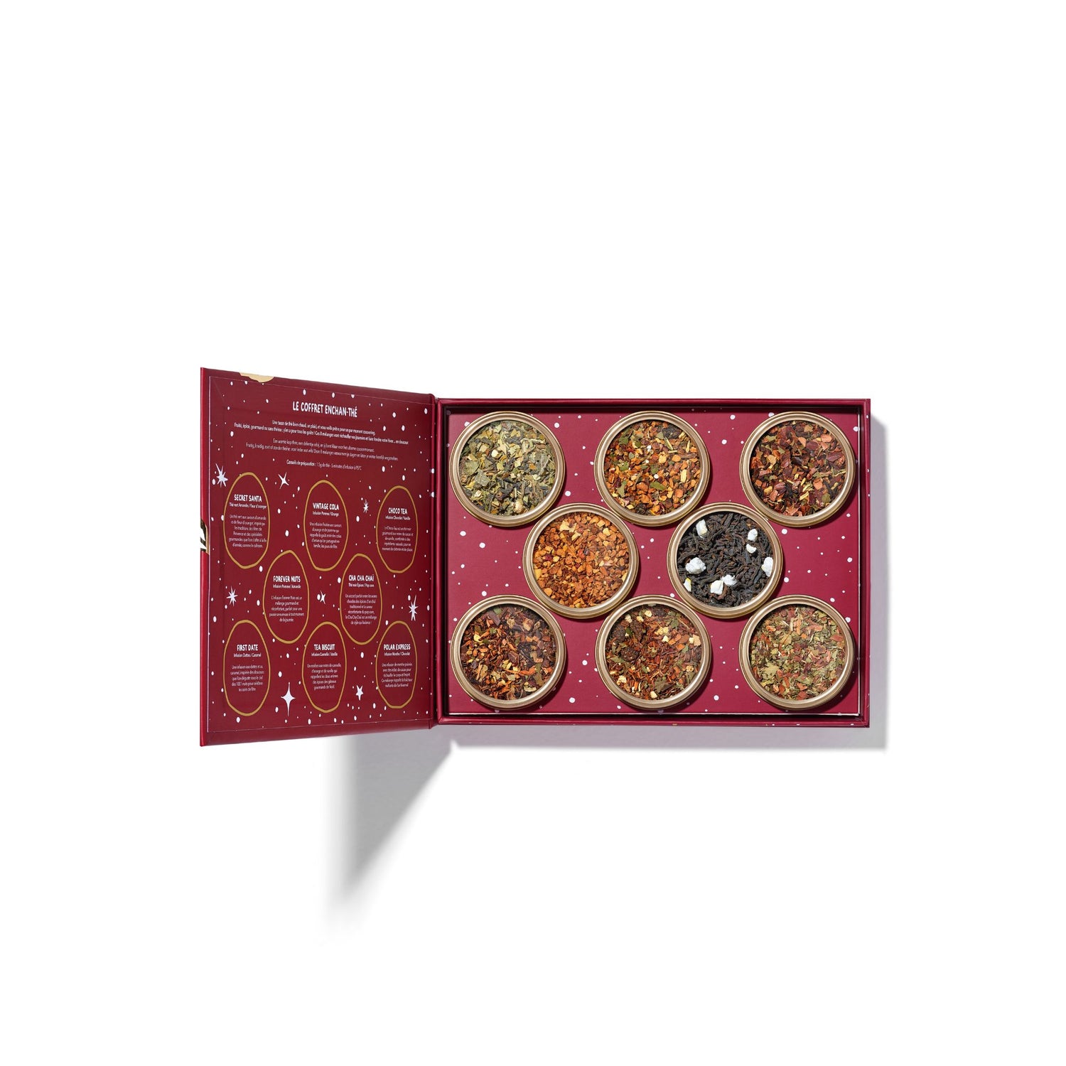 Le Coffret Enchan-thé (20 sachets) invite à redécouvrir quatre mélanges iconiques — Secret Santa, Pancake Party, Nordic Sauna et Cha Cha Chaï — chacun évoquant un instant d’hiver : un matin enneigé, une soirée cocooning ou un goûter partagé entre amis.