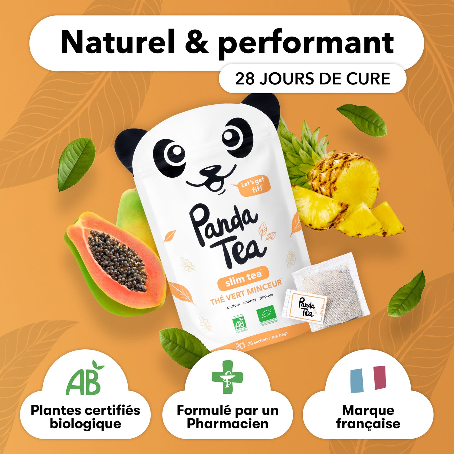 Liste des ingrédients : Thé vert* (38%), Maté* (28%), Moringa*, Arôme naturel de papaye, Arôme naturel d'ananas, Morceaux d'ananas*, Poudre de guarana* (1%)